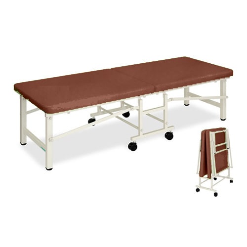 折りたたんで簡単に移動収納ができる直径6cmキャスター付き施術台。院内のスペースを公立的に活用できる実用的なコンパクト収納設計。 |