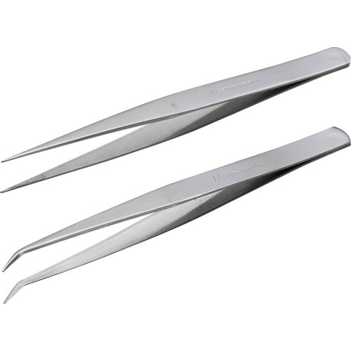 先端が直型と先曲型の2個セットです。先が鋭く、傷つけにくいフラット面です。微小なパーツ類などのつまみに。 |
