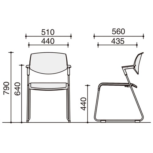従来の肘なしチェアーと同等の幅寸法を実現。W1800テーブルで3脚使用できる肘付きチェアーです。 |