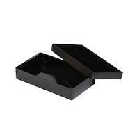 組立式の黒い寿司折箱です。表面にはフィルム加工をしており、内側も黒一色で高級感があります。細長い形状なので豪華な具材のサンドイッチやチョコレートなどの上質なスイーツにもぴったりです。 |
