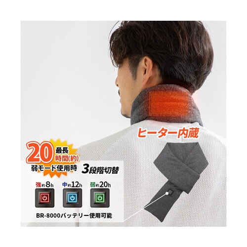 首筋を暖めるヒーターマフラー。肌触りの良い生地でつけ心地も抜群。見た目もお洒落に防寒対策ができます。 |