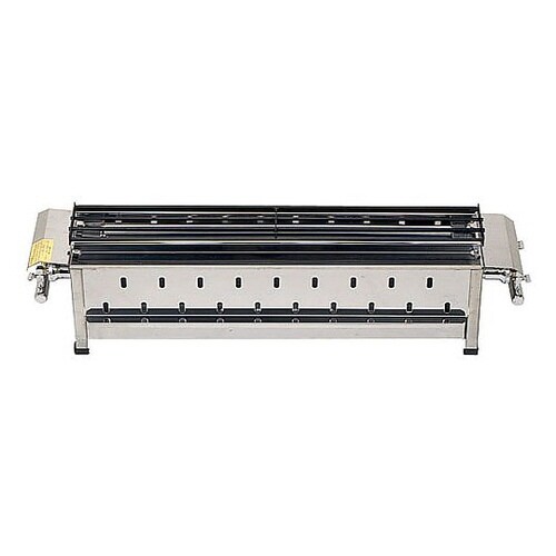 焼き汁、油が直接バーナーに落ちずに、汁受(水槽)に直接落ちますので煙やススが出にくくなっています。焼き鳥用15cm串が一列で焼けます。左半分・右半分で分けて焼く事ができます。 |