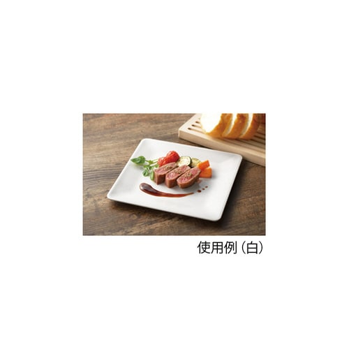 メラミン樹脂製の正角型の平皿です。メイン・前菜・デザート等、様々に使えるサイズです。フチの傾斜を抑え、食材やソースが流れにくい設計になっています |