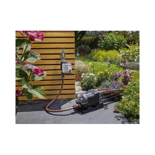 6パターンの散水プログラム設定が可能な散水タイマー。取り外し可能な高画質LCD画面。レインオフ機能−雨天の水やり休止日数を1−7日の間で設定。 |