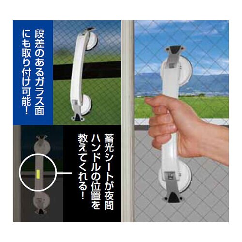 サッシ窓・引き戸用ハンドル。ワンタッチで吸着引き戸の開閉が楽に行えます。吸盤部が可動するので、段差のあるガラス面にも取付可能。 |