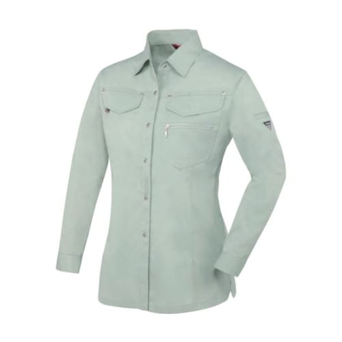 シャツのヨーク部分にはラベンダー色のパイピングがお洒落です。 |