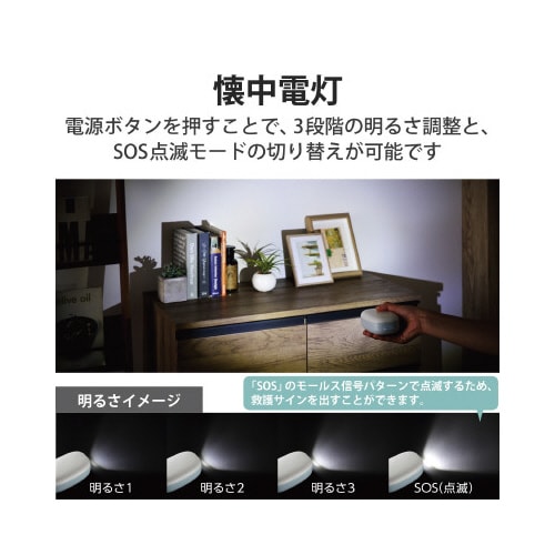 日常時は枕元ライトとして使用でき、災害時など、非常時には懐中電灯、スマートフォンの充電器としても使えるライトです。3段階の明るさ調整ができ、懐中電灯はSOSパターンでの点滅も可能です。 |
