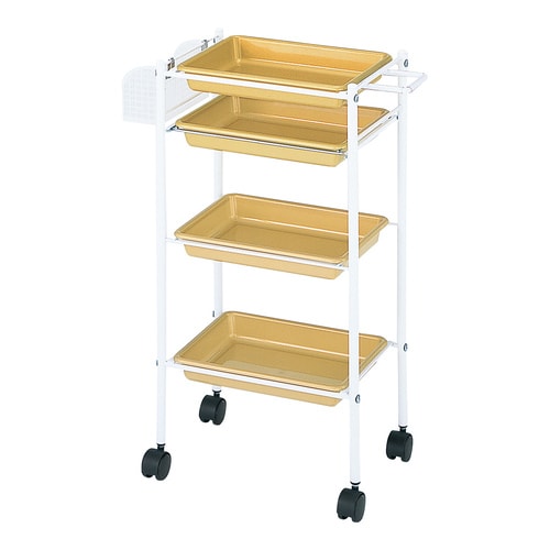カラフルな軽量ワゴンで、トレーは容易に取り外せます。取っ手は保護ビニールカバー付きで、ドライヤー等のホルダーを兼ねています。ボトル類の収納に便利なメッシュラック付きです。 |