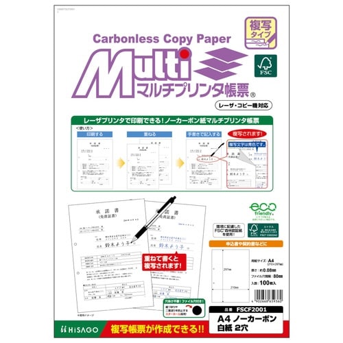 FSC(R)認証プリンタ帳票A4複写白紙2穴 FSCF2001 プリンタ帳票マルチタイプ 1Pk(100枚)