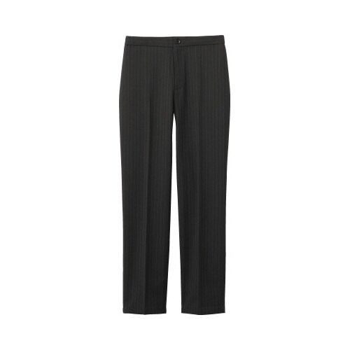 メンズライクなクラシックストライプ柄の素材で一見スーツのスラックスに見えるようなセンタープレスの入ったキレイ目パンツです。ストレッチ感もプラスしドローストリング入りでウエストも調整可能です。 |