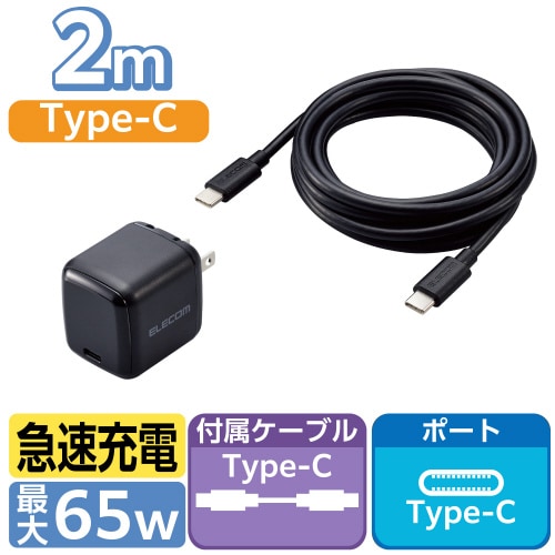 AC充電器 スマホ・タブレット用 PD 65W C1ポート C−Cケーブル付属 2.0m ブラック