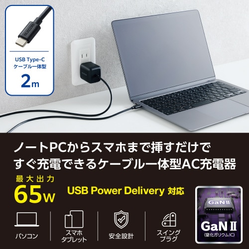 AC充電器 スマホ・タブレット用 65W AC充電器(Cケーブル一体型 2m) ブラック