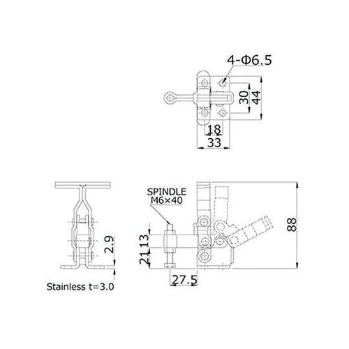 下方押え型クランプ。しっかり押さえて脱着ラクラク。ハンドル縦型。複雑な形状でも面さえあれば押さえられる。 |