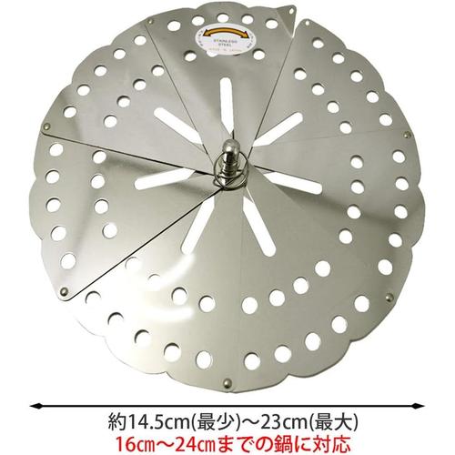 鍋に合わせて伸び縮み可能な、ステンレス落し蓋&蒸し皿です。14.5−23cmまで調節可能。 |