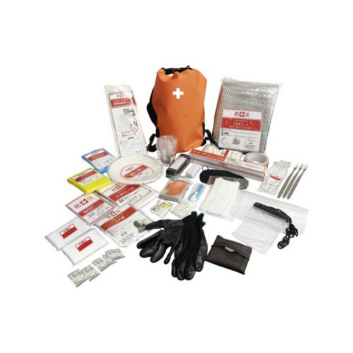 厳選された防災用品30点が入った防水リュックタイプの防災バッグ。台風など水害にも強い。 |