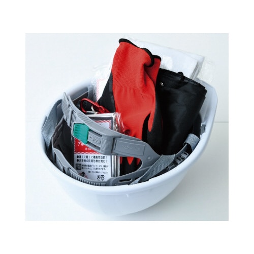 咄嗟な緊急時にすぐ持ち出せるアイテムを7点厳選しました。ヘルメットをデスクの横に掛けておけばもしもの時も安全です。 |