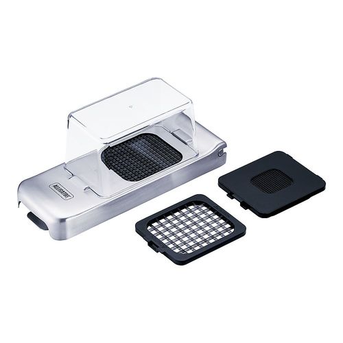 玉ねぎ等をカット台の上にのせ、上から刃物を下ろすだけで 簡単にみじん切りができます。3mm刃を使えばにんにく等小さい野菜のみじん切りもできます。 |
