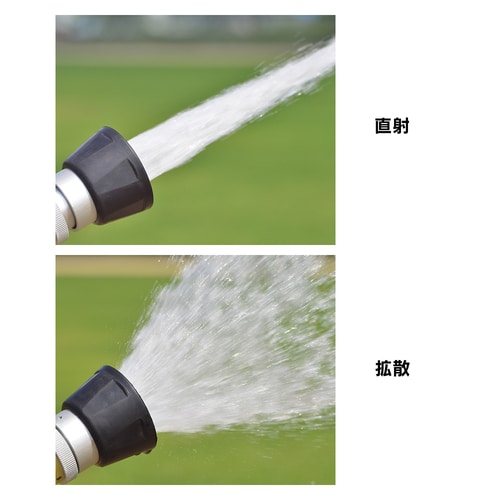 ■水流切替:先端操作で直射・拡散・止水。■運動場、農業用の散水に最適。■先端がゴム製のため、操作性がよく衝撃から本体を守ります。■ノズル本体ネジはG1の内ネジ。