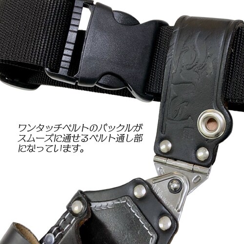 150−200mmまでのペンチやニッパーの他、ドライバーも収納できるダブルスイング式黒革工具差しです。 |