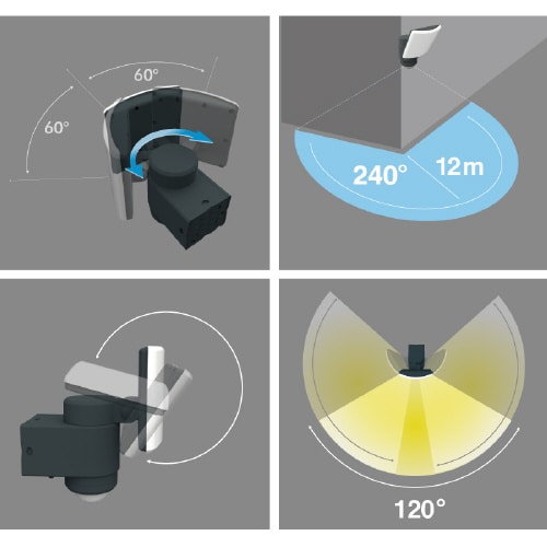 人の動きに合わせてカメラとライトが自動追尾。録画・記録。可動・探知・照射範囲。常夜灯機能。 |