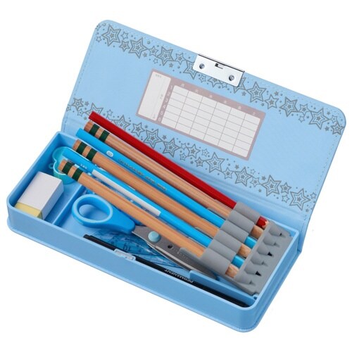 太さの違う鉛筆も並べて差し込めるサイズ調整機能付きペンホルダー。フタには滑り止め加工プリント入り。折り返すとトレイのように使えて、滑りにくく使いやすい。4ファイル対応ランドセルには横向きに入ります。 |