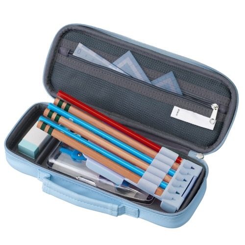 軽くて使いやすいペンケース。太さの違う鉛筆も並べて差し込めるサイズ調整機能付きペンホルダー。着脱式のペンホルダーがあり、長く使えます。蓋裏にはファスナー付きメッシュポケット付き。 |