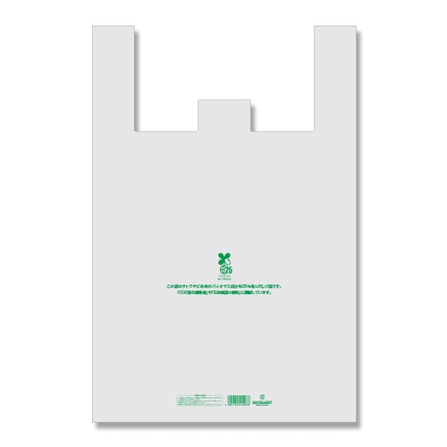 生物由来の有機資源を原料としたバイオマス成分を25%含んだレジ袋です。ゆったり、たっぷりのビッグサイズ。バイオマスマーク取得済みで、「プラスチック製買物袋有料化制度」の対象外とすることが可能です。 |