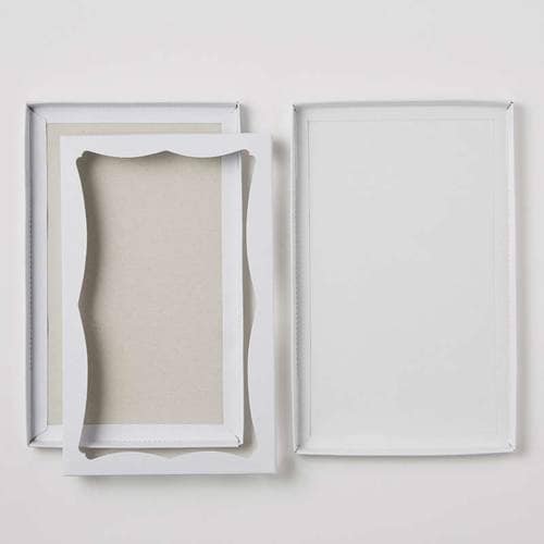 身・フタ・中枠の3種のパーツから組み立てる、フタをかぶせるタイプの白無地ボックスです。四方のサイドを折り込んで仕上げる組み立て式です。フタは表面に光沢を持たせており高級感があります。