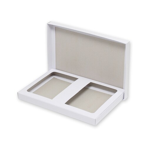 身・フタ・中枠の3種のパーツから組み立てる、フタをかぶせるタイプの白無地ボックスです。四方のサイドを折り込んで仕上げる組み立て式です。フタは表面に光沢を持たせており高級感があります。 |