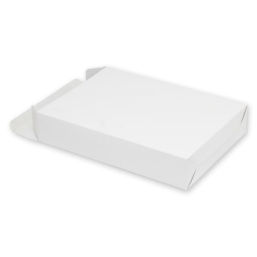 汎用性の高い白無地の組立箱です。フタと本体が一体となっており、底面は四方を折り込み、反対側のベロとフタを閉じて仕上げるタイプです。