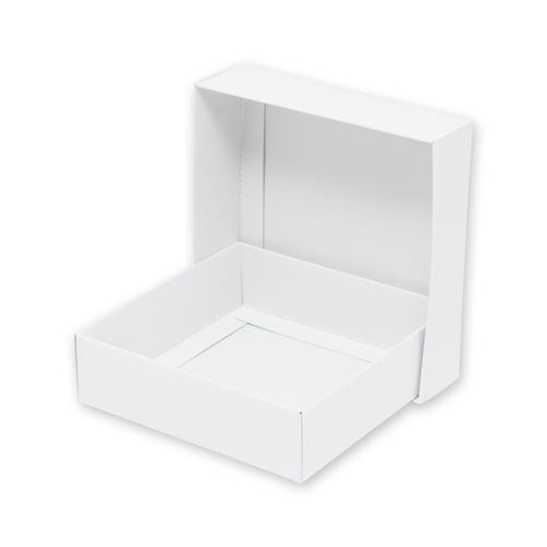 汎用性の高い白無地の組立箱です。フタと本体を別々に組み立てるかぶせブタ式で、四方を立ち上げて折り込んで仕上げるタイプです。縦・横のサイズが同じ正方形の規格です。 |
