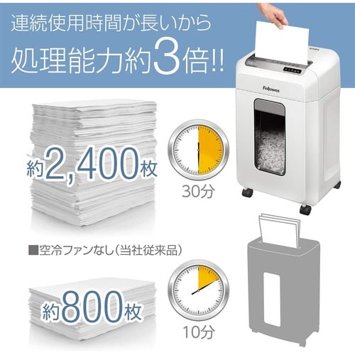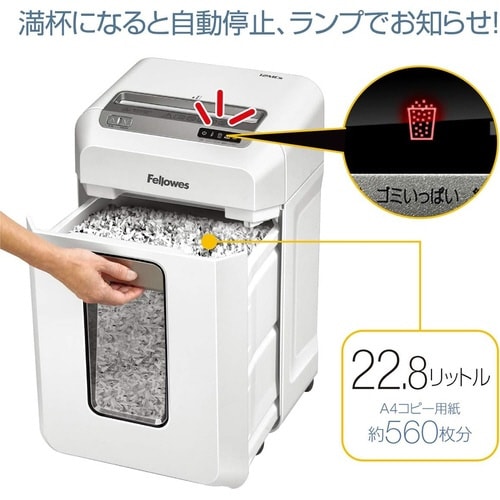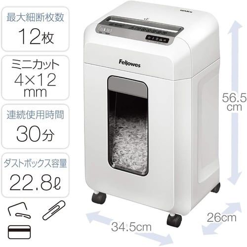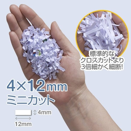 いちどに12枚まとめてスピード細断、連続30分使用OKの頼れるモデル。シーンを選ばないホワイトカラーで、オフィスにも家庭にもフィットします。A4コピー用紙約560枚分の裁断くずが収容可能。 |