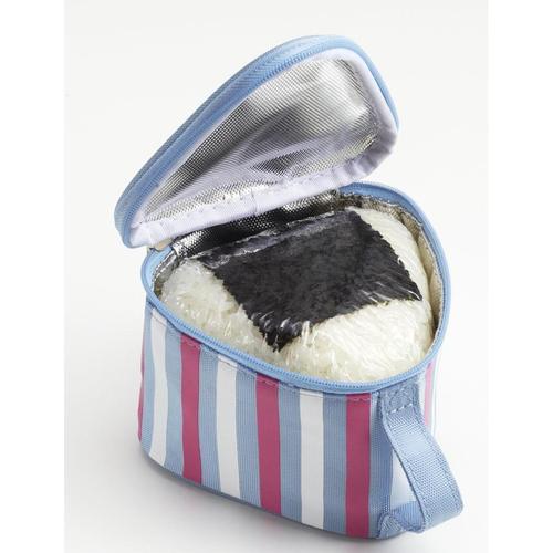 おにぎりが潰れにくい、保冷タイプのおにぎりケース。コンビニ寸法のおにぎりが2個入る。内側がアルミで保冷効果がある |
