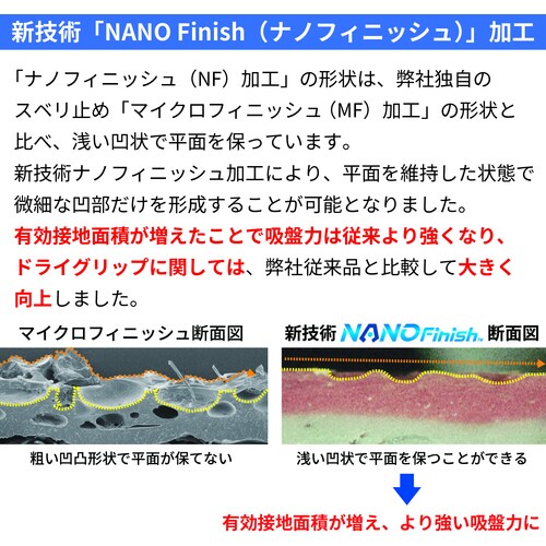 「ナノフィニッシュ加工」により高いグリップ力と耐摩耗性を持ち、乾燥環境で優れた性能を発揮します。環境に優しく、抗菌・抑臭加工済みで、エコテックス認証取得の安全な製品です。 |