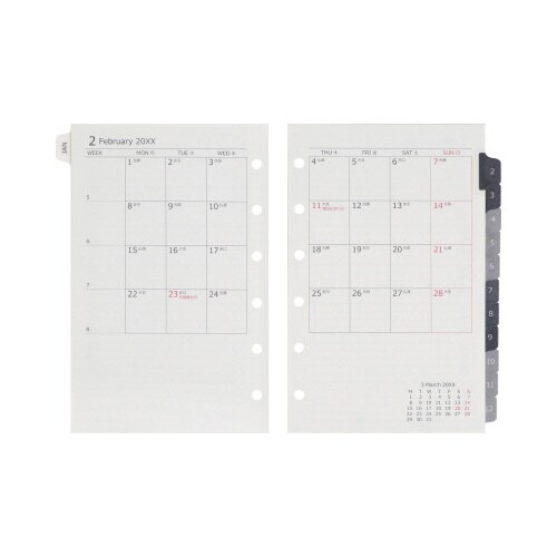 週間ダイアリーは、1日を午前と午後でスケジュールを分割して書けます。週間ダイアリー片面は、たっぷり書けるメモスペース。週間ダイアリーには、何週目かがわかるインデックスが付いています。 |