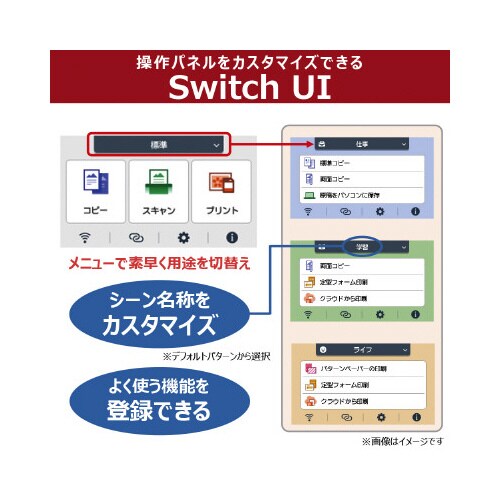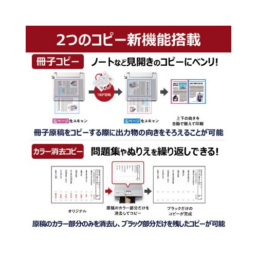 6色ハイブリッドインク搭載複合機、A4フチなし、4.3型タッチパネル、背面給紙/前面カセット、自動両面、SDカード、ディスクレーベル、自動紙幅検知、QRコードダイレクト接続。保証期間/1年間 |