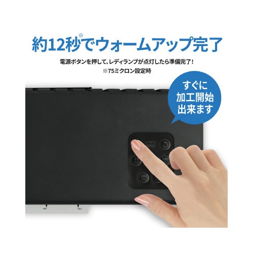 電源オンから最速28.5秒で一枚目が加工完了出来る高速6本ローラーラミネーター。5段階の加工設定で各フィルム厚に適した設定が可能。対応フィルム厚は最薄75ミクロン、最厚250ミクロンまで加工対応可能。 |