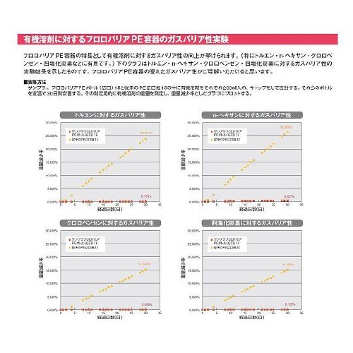 ポリエチレン容器の表面をフッ素化し、耐有機溶解性、ガスバリア性、耐薬品性を高めた広口ポリ容器 |