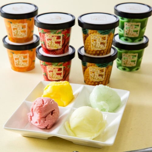 フルーツの爽快感をそのままアイスにしたようなフルーツティアラのソルベ。青リンゴ・苺・パインアップル・ミカンの4つの味が楽しめます。 |