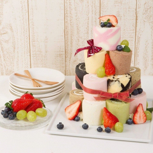 自分で積み上げる、遊び心も満点のロールケーキキットパッケージを開くと、ロールケーキタワー用のミニロールケーキがぎっしり詰まっています。 |