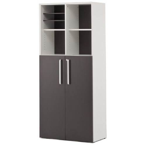グレーの背板がスタイリッシュなプリーマシリーズの格子型シェルフ2列5段グレー共通扉付き。棚板は、上から2段目が固定棚、可動棚板大(ホワイト)が6枚と可動棚板小(グレー)2枚が付属しています。 |