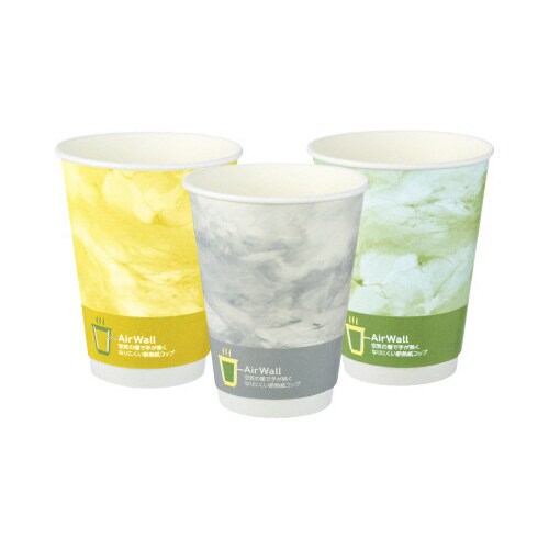 持ち手部分を紙で二重巻きにして空気の層を作るエアウォールR構造で中身の飲料の熱を手に感じさせにくい高い断熱性能をもつ紙コップ。来客用に適した高級感のあるマーブルデザイン。結露しにくく冷たい飲料にも。 |