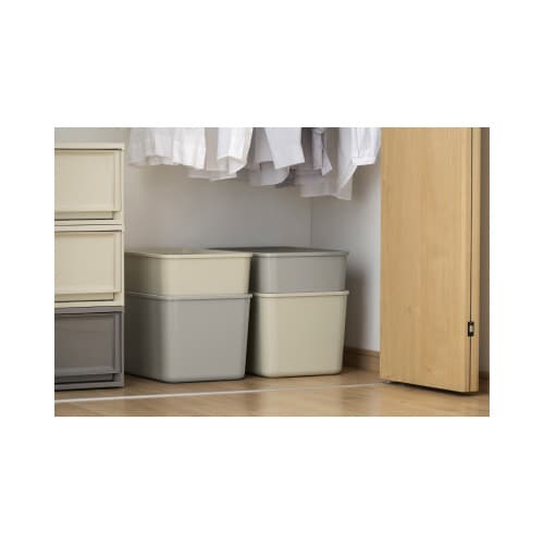シンプルで丸みのあるやわらかなデザインのフタ付き積み重ねBOXです。フタにふちがあるので、積み重ねても安定感があります。フタはトレーとして使用でき、小物も置けます。丸洗いができるので衛生的です。 |