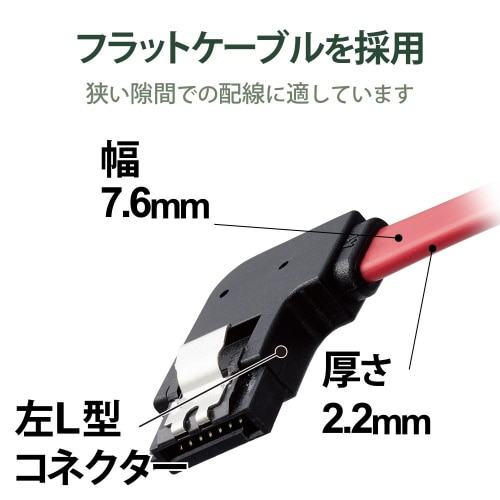 UL規格に対応し、仕様固定とともに長期供給を実現したSATAケーブルです。L字型のコネクターを採用することにより、狭い機器内での配線にも最適です。
