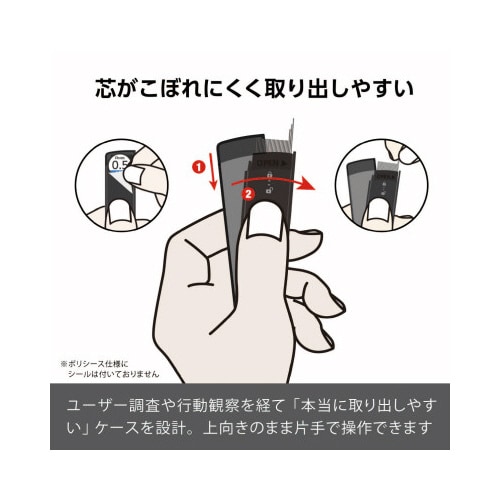 芯はなめらかで折れにくく、紙が汚れにくい。シンプルなデザインのケースは操作性が高く片手で扱いやすい。 |