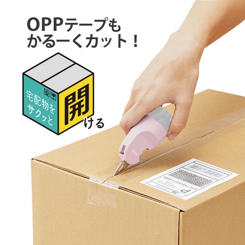 段ボールをサクッと開けて、宛名ラベルをイッキに隠す。段ボールのガムテープやOPPテープをサクッとカット。新開発インクで、つるつるした紙の印字も黒々としっかり隠せる。使いやすく置きやすい本体形状。 |