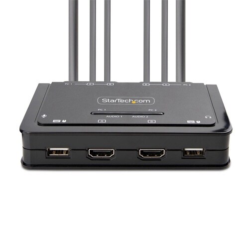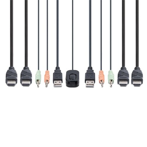 ケーブルを内蔵し、2台のDisplayPort対応パソコン間で、マウス、キーボード、デュアル4K60Hz DisplayPortモニターの共有が可能 |