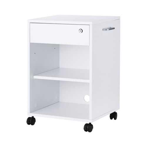 デスク下やサイドで使える木製のワゴンです。移動に便利なハンドル付きで、引き出しには鍵が付いているので書類などの保管も出来ます。棚の高さが調節可能でA4サイズのファイルも入れられます。 |