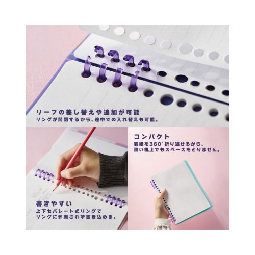 書くときにリングが「手にふれない」、大人気リングノートに新デザインが登場!上下に分かれたセパレート式リングで、書きやすく、リーフの追加・交換も可能です。 |
