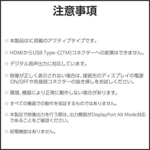 USB Type−C(TM)ポート搭載機器の映像信号を変換し、HDMI(R)ポート搭載のディスプレイ・テレビ・プロジェクターなどに出力できる映像変換ケーブルです。 |